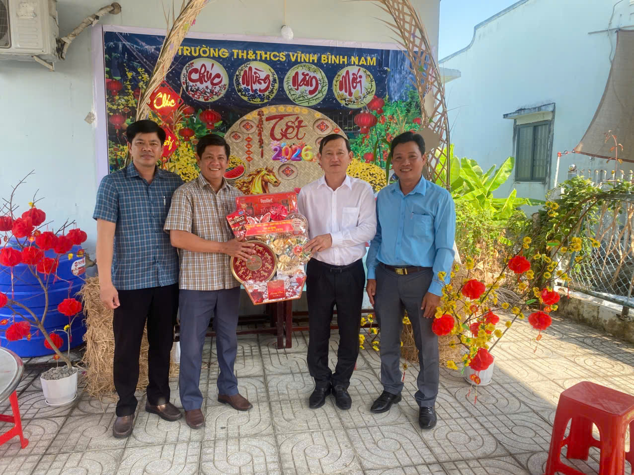 Sáng ngày 10.2.2026, Đoanftawngj quà chúc tết năm Bình Ngọ 2026 đã đến đơn vin Trường TH&THCS Vĩnh Bình Nam để tặng quà và chúc tết do ông Nguyễn Văn Đức – Chủ tịchUBND xã Vĩnh Bình làm trưởng đoàn, tiếp đoàn phía nhà trường có thầy Nguyễn Trường An – Bí thư chi bộ, Hiệu trưởng và các giáo viên trực văn phòng. Đại diện đoàn ông Nguyễn Văn Đủ đã trao quà và gửi lời thăm hỏi, chúc tết đến toàn thể thầy cô của trường. Thầy Nguyễn Trường An đại diện cho đơn vị đã nhận quà và cảm ơn đoàn đã đến trường chúc tết và tặng quà cho nhà trường.