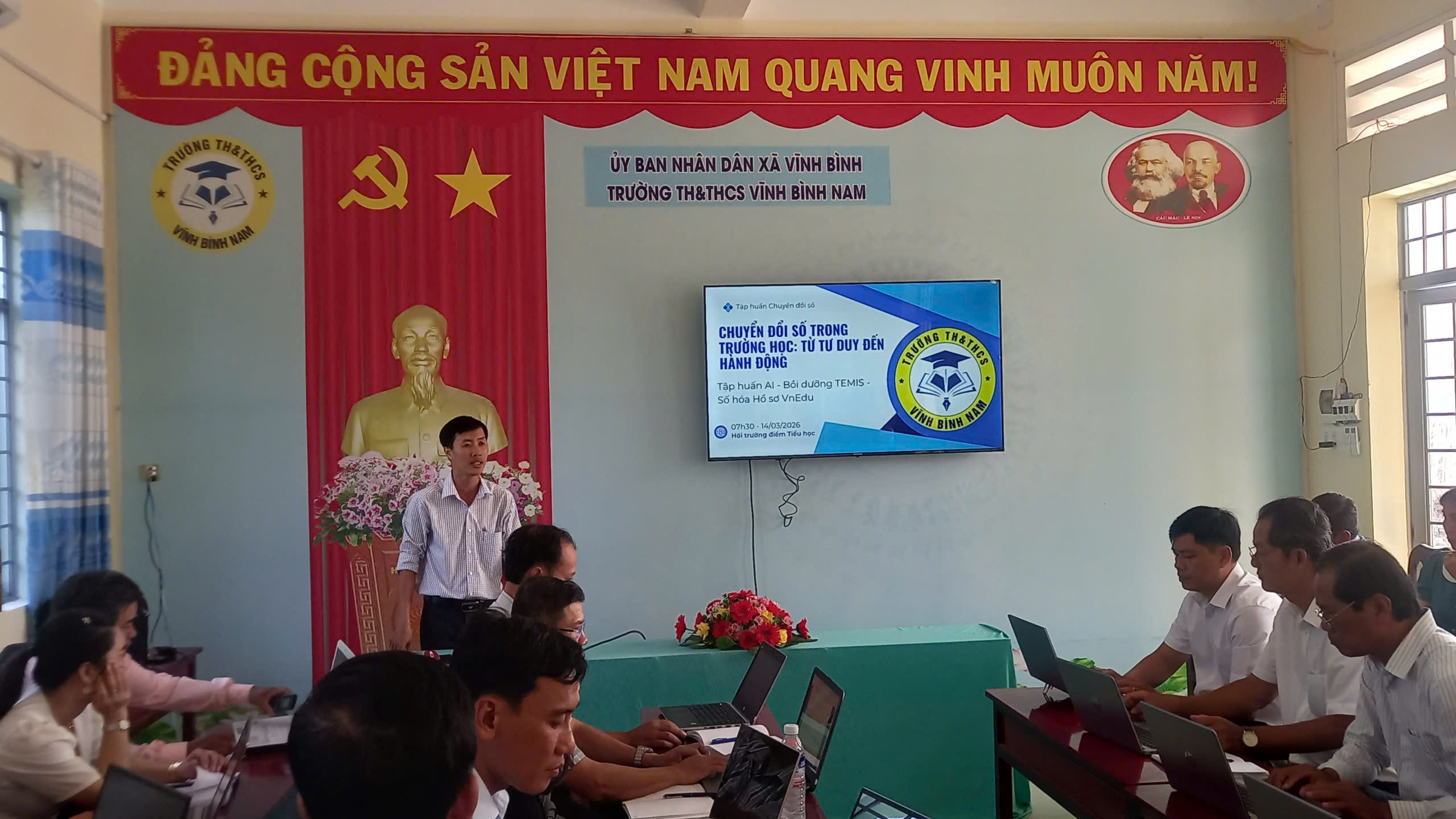 Sáng nay ngày 14 tháng 3 năm 2026 tại Hội trường Trường TH&THCS Vĩnh Bình Nam, chuyên môn đã triển khai tập huấn trao đổi chuyển đổi số trên phần mềm hồ sơ giáo dục trên Vnedu do thầy Trần Đình Duy – Giáo viên phụ trách Công nghệ thông tin của trường triển khai. Tham gia có lãnh đạo trường (BGH) và toàn thể giáo viên của trường về dự. Nội dung gồm tạo thư mục lưu trên hệ thống gmail, sử dụng AI trong goạn giảng giáo án và tạo slide bài giảng…